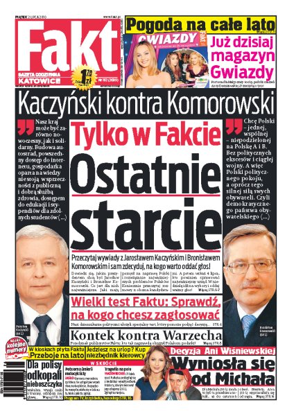 Przeczytaj wywiady z Jarosławem Kaczyńskim i Bronisławem Komorowskim i sam zdecyduj, na kogo warto oddać głos w niedzielnych wyborach; Marta Kaczyńska kończy porządkować rzeczy należące do jej rodziców; mieszkańcy pewnej wsi wykopali ciało nieboszczyka tylko po to, aby upozorować zabójstwo i wyłudzić odszkodowanie; sprawdź, jaka pogoda czeka nas w okresie wakacyjnym; kolejne małżeństwo Michała Wiśniewskiego wisi na włosku.