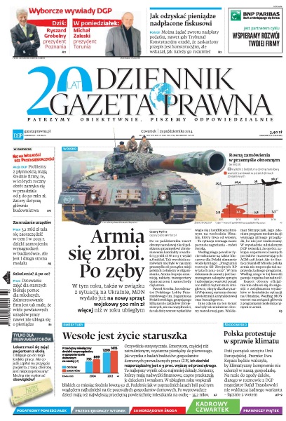 Można żądać zwrotu nadpłaty podatku, nawet gdy Trybunał Konstytucyjny orzekł, że zaskarżony przepis jest konstytucyjny, ale wskazał, jak należy go rozumieć; problemy z płynnością mają średnie firmy, te, w których roczny obrót zamyka się w przedziale od 5 do 50 mln zł - zatory dotyczą głównie budownictwa; 3,1 mld zł uda się zaoszczędzić w tym i w 2015 r. dzięki zamrożeniu wynagrodzeń w budżetówce; dotowanie zajęć dla starszych blokuje pomoc dla młodszych w tym roku, także w związku z sytuacją na Ukrainie, MON wydało już na nowy sprzęt wojskowy 500 mln zł więcej niż w roku ubiegłym; dziś początek szczytu Unii Europejskiej - premier Ewa Kopacz będzie walczyła, by klimatyczny kompromis nie uderzył w naszą gospodarkę; emerytom, częściej niż zatrudnionym, wystarcza pieniędzy do pierwszego. Dodatki: Gazeta Prawna, Kadry i płace, Ubezpieczenia i świadczenia, Skrzydła biznesu, Prawo na co dzień.