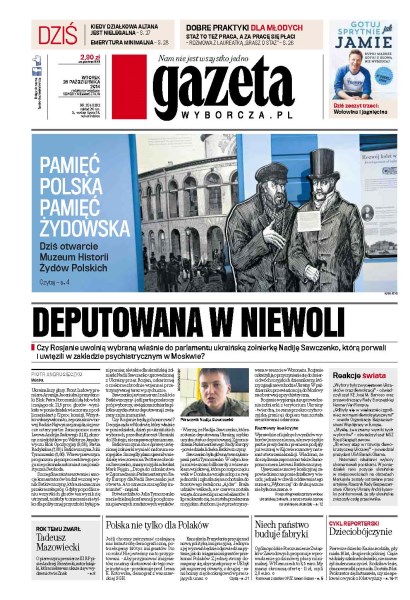 Dziś otwarcie Muzeum Historii Żydów Polskich; czy Rosjanie uwolnią wybraną właśnie do parlamentu ukraińską żołnierkę Nadiję Sawczenko, którą porwali i uwięzili w zakładzie psychiatrycznym w Moskwie; jeśli chcemy zatrzymać czekającą nas katastrofę demograficzną, potrzebujemy 140 tys. imigrantów; Ogólnopolskie Porozumienie Związków Zawodowych proponuje wprowadzenie godzinowej płacy minimalnej.