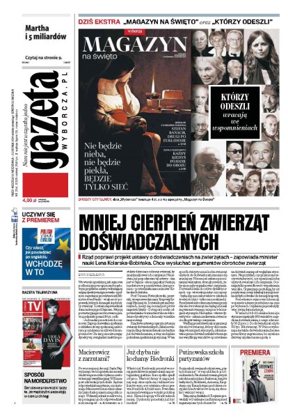 Rząd poprawi projekt ustawy o doświadczeniach na zwierzętach – zapowiada minister nauki Lena Kolarska-Bobińska, chce wysłuchać argumentów obrońców zwierząt; po wczorajszej decyzji Sądu Najwyższego wróci sprawa umorzenia śledztwa przeciwko byłemu szefowi komisji weryfikacyjnej WSI; właściciel Biedronki przeżył wczoraj prawdziwe trzęsienie ziemi na portugalskiej giełdzie; Rosja szkoli swoją młodzieżową „piątą kolumnę” w republikach postradzieckich.