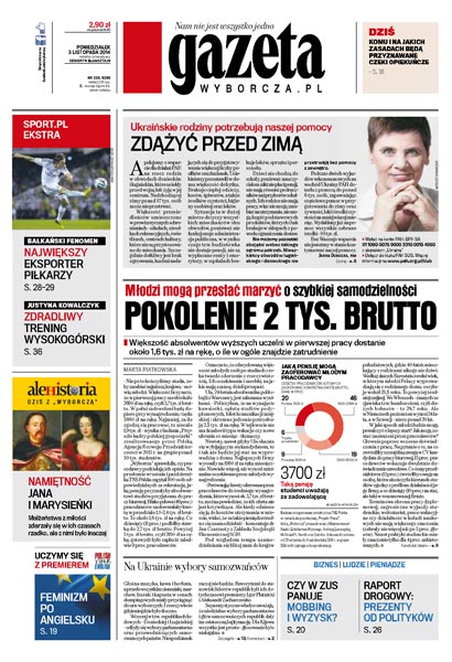 Młodzi mogą przestać marzyć o szybkiej samodzielności, bo większość absolwentów wyższych uczelni w pierwszej pracy dostanie około 1,6 tys. zł na rękę, o ile w ogóle znajdzie zatrudnienie; na Ukrainie wybory samozwańców; czy w ZUS panuje mobbing i wyzysk; raport drogowy: prezenty od polityków; bałkański fenomen: Serbia jest największym eksporterem piłkarzy; komu i na jakich zasadach będą przyznawane czeki opiekuńcze; czy Trójmiasto będzie pieszym miastem.