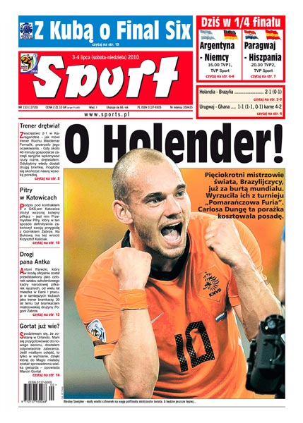 Pięciokrotni mistrzowie świata, Brazylijczycy, już za burtą mundialu – zostali wyrzuceni przez „Pomarańczową Furię”, co Carlosa Dungę kosztowało posadę; Ghana była o krok od wejścia od półfinału, ale ostatecznie triumfował zespół Urugwaju; Argentyna – Niemcy – rewanż za spotkanie sprzed czterech lat; Hiszpanie po 60 latach znów mogą zagrać w półfinale, ale muszą pokonać Paragwajczyków; po dekadzie nieobecności na międzynarodowych arenach, „Niebiescy” odnieśli pierwsze od 36 lat wyjazdowe zwycięstwo w europejskich pucharach; Ruch Radzionków: licencja „pod nadzorem infrastrukturalnym”; ostatnia deska ratunku dla Odry Wodzisław; Kubańczycy nam niestraszni twierdzą siatkarze przed kolejnymi meczami Ligi Światowej; wywiad z Marcinem Gortatem; Hiszpan Rafael Nadal i Czech Tomas Berdych zagrają w niedzielnym finale turnieju w Wimbledonie.