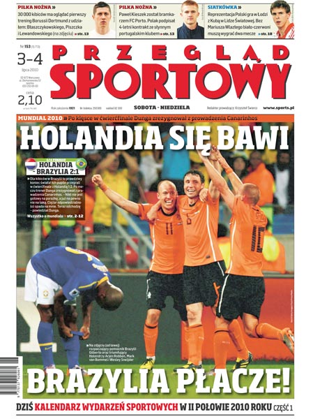Holandia się bawi, a Brazylia płacze po pierwszym ćwierćfinale mundialu; Dunga rezygnuje z prowadzenia reprezentacji Brazylii; Niemcy – Argentyna: Leo Messi szykuje się na pierwszego gola w mundialu, a Miroslav Klose zbliża się do rekordu; wojna o półfinał między Hiszpanią a Paragwajem już trwa; wywiad z Robertem Lewandowskim, piłkarzem Borussi Dortmund; transfery w polskiej Ekstraklasie; I część kalendarza wydarzeń sportowych w II połowie 2010 roku; Liga Światowa w siatkówce: Polacy muszą w Łodzi wygrać oba mecze przeciwko Kubie; w niedzielnym finale Wimbledonu wystąpią Rafael Nadal i Tomaš Byrdych; Speedway Ekstraliga: trzy zespoły rozpoczynają zaciętą walkę o ostatnie wolne miejsce w fazie play-off; dziś startuje kolarski Tour de France; lekkoatletyka: pięcioro Polaków w Diamentowej Lidze w Eugene; wywiad z Marcinem Gortatem.