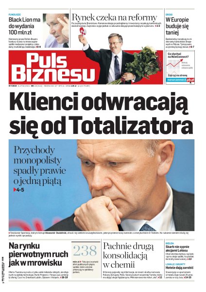Inwestorzy przyjęli wyniki głosowania bez entuzjazmu – wiedzą, że to nie prezydent ma obniżać deficyt; sejmowe komisje są gotowe do pracy nad ustawami gospodarczymi; w pierwszym półroczu na gry i loterie państwowej spółki klienci wydali aż około 300 mln zł mniej niż przed rokiem; firmy budowlane narzekają na niskie ceny kontraktów drogowych; Azoty mogą przejąć pomorskiego producenta nawozów; gwarantowana stopa zwrotu z wynajmu apartamentu w condhotelu to 25 proc. w ciągu 3 lat; konsorcjum firm Acciona Infraestructuras i Mostostal Warszawa zmodernizuje dworzec Gdynia Główna; Dariusz Lubera, który od dwóch lat kieruje Tauronem, powinien próbować pozytywnie zaskoczyć rynek efektywnością operacyjną grupy.