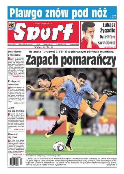 Niemcy chcieli sobie strzelić w głowę, kiedy okazało się, że na mundialu zabraknie Michaela Ballacka – a teraz nikt o nim nie pamięta – zauważa były zawodnik klubów zza zachodniej granicy; trzech piłkarzy urodzonych w Polsce może wyjść dziś na boisko w najważniejszym meczu Niemców od wielu lat; czy hiszpański byk po raz drugi ugodzi w ambicje Joachima Loewa; po 32 latach Holendrzy znowu awansowali do finału mundialu – w RPA na razie nie przegrali ani jednego meczu; na zapleczu ekstraklasy najdotkliwsze straty poniosła Odra Wodzisław, najmocniej natomiast zbroi się Pogoń Szczecin, która przymierza się do awansu.