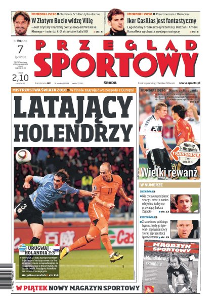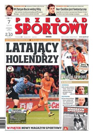 Szósta wygrana Oranje, tym razem po dramatycznym meczu; w dzisiejszym meczu nikt nie będzie się bronił, bo Niemcy i Hiszpanie stawiają na atak – to bardzo dobra wiadomość, że taki właśnie styl gry święci w tych mistrzostwach sukcesy; wywiad z Antonim Ramalletsem, bramkarzem Hiszpanii z mundialu w 1950 roku; Piotr Trochowski ma dzisiaj zastąpić rewelację turnieju – Thomasa Müllera; występ Macieja Sadloka przeciw Szachtiorowi Karaganda zależy od rozmowy z trenerem Waldemarem Fornalikiem; rozgrywający Trentino Volley mówi nam, dlaczego musiał odejść z reprezentacji; historia o tym, dlaczego krakowski klub nie zagra w lidze europejskiej na własnym stadionie.