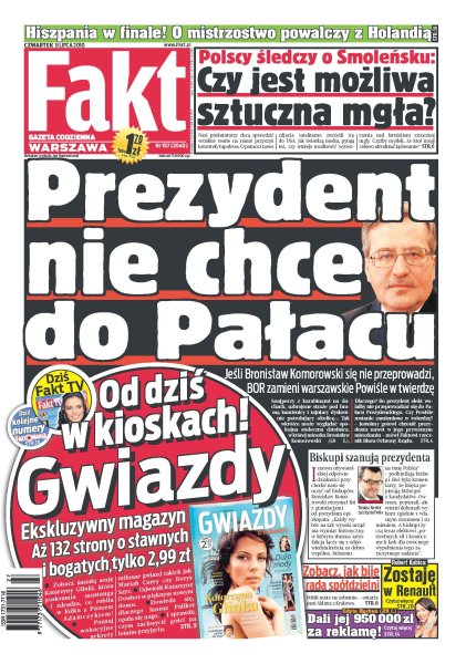Jeśli Bronisław Komorowski się nie przeprowadzi, BOR zamieni warszawskie Powiśle w twierdzę; prokuratorzy wojskowi liczą, że USA pomoże nam wyjaśnić tajemnicę katastrofy tupolewa; prezes PiS dopuścił do głosu emocje – gdy w minioną niedzielę wspominał brata, niemal płakał; wielki finał akcji All for Planet, Faktu, Philipsa i Allegro; Edyta Herbuś weszła na szczyt – zarobiła 950 tysięcy złotych za reklamę; Laura Samojłowicz i jej nowy ukochany dali prawdziwy pokaz namiętności podczas obiadu w centrum handlowym; Hiszpanie pokonali Niemców i to oni w finale mundialu zagrają z Holandią – Niemcom pozostaje mecz o 3. miejsce z Urugwajem; Małgorzata Glinka wraca do kadry.