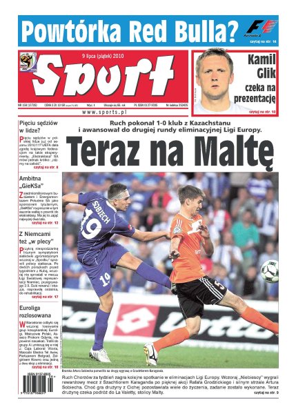 Ruch pokonał 1–0 klub z Kazachstanu i awansował do drugiej rundy eliminacyjnej Ligi Europy; Hiszpania jest zespołem bez słabego punktu; po raz pierwszy w historii europejska reprezentacja zdobędzie mistrzostwo świata poza naszym kontynentem; kapitan reprezentacji Niemiec najchętniej nie grałby w meczu o trzecie miejsce; z siedmiomilionowym budżetem i Energomontażem Południe SA jako sponsorem tytularnym, „GieKSa” rozpocznie w tym sezonie walkę o powrót do ekstraklasy; Robert Kubica przyjechał do Wielkiej Brytanii z nowym kontraktem w kieszeni i sporą dawką optymizmu; w pierwszym meczu w Katowicach Polacy po raz kolejny musieli uznać wyższość niemieckiej drużyny.