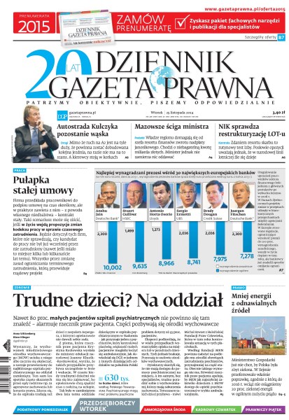 Autostrada Kulczyka pozostanie wąska, mimo że ruch na A2 jest na tyle duży, że powinna zostać dobudowana kolejna jezdnia; Mazowsze ściga ministra – władze regionu domagają się od szefa resortu finansów zwrotu nadpłaty Janosikowego; NIK sprawdza restrukturyzację LOT-u; pułapka stałej umowy; najlepiej wynagradzani prezesi wśród 30 największych europejskich banków; nawet 80 proc. małych pacjentów szpitali psychiatrycznych nie powinno się tam znaleźć – alarmuje rzecznik praw pacjenta.
