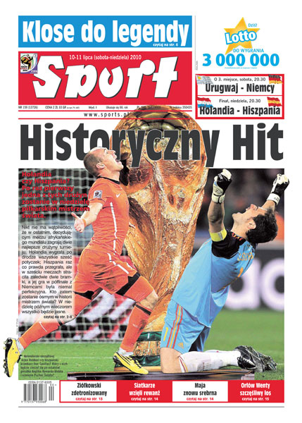 Ani Holandia, ani Hiszpania nie zdobyły jeszcze mistrzostwa świata – w niedzielę historyczne wydarzenie; Miro Klose może dziś zdobyć trzeci medal mistrzostw świata i zostać najlepszym strzelcem w historii finałów; Jerzy Dudek o swoim faworycie w niedzielnym meczu; LeBron James w przyszłym sezonie zagra w drużynie Heat; drugi dzień 86. mistrzostw Polski na stadionie Sprintu Bielsko-Biała przyniósł kilka