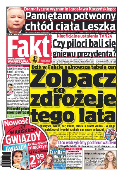 Czy piloci prezydenckiego Tu-154 próbowali lądować w skrajnie złych warunkach, gdyż obawiali się gniewu Lecha Kaczyńskiego; tabela cen – zobacz co zdrożeje tego lata; Anna Wiśniewska opowiada o swoim małżeństwie z gwiazdą zespołu Ich Troje; premier Donald Tusk znów występuje w roli piłkarza; co dało Polsce zwycięstwo w bitwie pod Grunwaldem w 1410 roku; wywiad z Pawłem Kukizem.