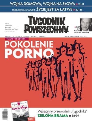 Temat Tygodnika - Pokolenie porno: internetowe życie seksualne nastolatków, uzależnienie od pornografii, czym jest pornografia i jak wygląda polski rynek; nowa odsłona wojny polsko-polskiej; konflikt wokół krzyża na Krakowskim Przedmieściu; w czym imieniu mówią biskupi, chcąc prawnego zakazu dla przeprowadzania zabiegów sztucznego zapłodnienia in vitro; prof. Charles Taylor, wybitny kanadyjski badacz procesów sekularyzacji, o chrześcijaństwie przyszłości; „afera Bettencourt” wywołuje polityczne trzęsienie ziemi na szczycie władzy we Francji; Jan Karski - niewygodny bohater; ukazała się najbardziej znana i ceniona książka Cormaca McCarthy’ego, „Krwawy południk”; wystawa fotografii Andreasa Feiningera w Krakowie. Ponadto - Magazyn Literacki 7/2010, poświęcony reaktywacji pisarstwa Dostojewskiego.