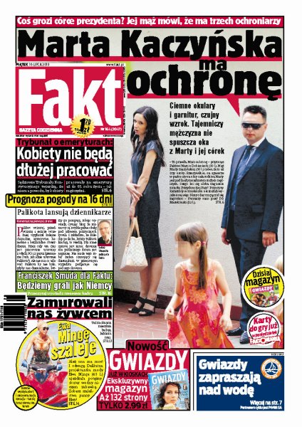 Marta Kaczyńska ma prywatną ochronę - co grozi córce tragicznie zmarłego prezydenta; jakie zmiany w PiS i w Jarosławie Kaczyńskim zaszły po wyborach prezydenckich; Anna Komorowska chce być piękną pierwszą damą i już zaczyna dbać o swój wygląd; tajne spotkania Mirosława Drzewieckiego; Ewa Minge na skuterze wodnym; Franciszek Smuda zapowiada, że w reprezentacji Polski pojawią się nowi zawodnicy; jak wygląda fabryka, w której produkowane są bolidy dla Roberta Kubicy.