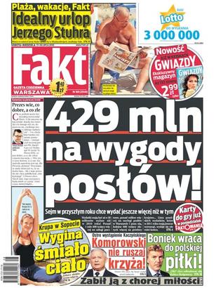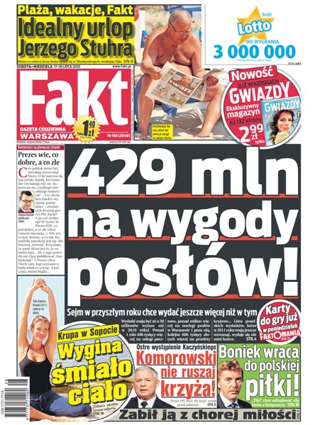429 milionów złotych na wygody posłów – Sejm w przyszłym roku chce wydać jeszcze więcej niż w tym; Ludwik Dorn: VIP-y latają gratami z winy PO; Jarosław Kaczyński: krzyż musi zostać; naga prawda o aniołkach Napieralskiego; zabójstwo z chorej miłości; w jaki sposób organizm reaguje na upał; Joanna Krupa dba o swoje walory; idealny urlop Jerzego Stuhra; Zbigniew Boniek wraca do polskiej piłki; kompromitacja jest blisko: polskie drużyny w takiej formie jak teraz szybko odpadną z pucharów; Formuła 1 w Polsce: na Torze Poznań Robert Kubica pokaże swoje umiejętności.
