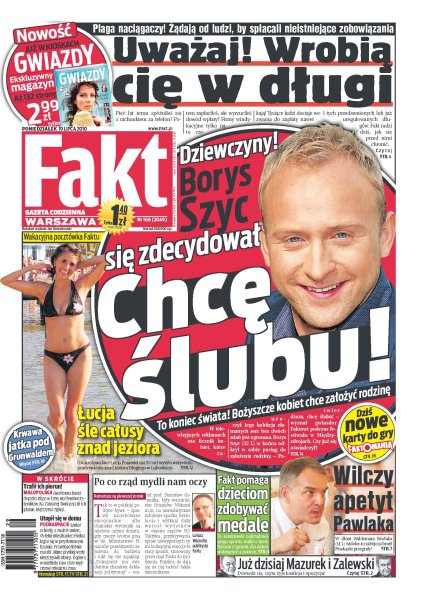 Próba oszczędzania na rencistach to uderzenie w jedną z najsłabszych grup społecznych; minister pracy Jolanta Fedak szykuje Polakom prawdziwą rewolucję w naliczaniu rent; Waldemar Pawlak ma wielki apetyt; niestraszny był żar lejący się z nieba i szczęk złowrogich mieczy – jak 600 lat temu, tak i w ostatnią sobotę pokonaliśmy Krzyżaków; rodziny czterech rybaków, którzy w sobotę wypłynęli w morze i zaginęli na Bałtyku, modlą się o cud; Borys Szyc chce się żenić; Andrzej Łapicki na festiwalu w Międzyzdrojach zachwycił wszystkich swym nowym sportowym wizerunkiem; Karol Bielecki nie poddał się po koszmarnym wypadku i wraca do gry.