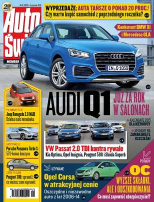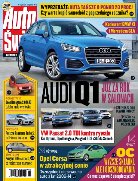 Aktualności: nowości Audi do końca 2017 roku, tani Volkswagen, kalendarz motoryzacyjny 2015; testy: VW Passat kontra Kia Optima, Opel Insignia, Peugeot 508 i Skoda Superb, Kia Carens, Jeep Renegade, Seat Toledo; porady: wyprzedaże aut z rocznika 2014, ubezpieczenia – nowe regulacje, szybka pomoc, zamarznięte auto; z drugiej ręki: BMW X6, Opel Corsa D, zrób to sam – Peugeot 306; fascynacje: Porsche Panamera Turbo S, Subaru 1800.