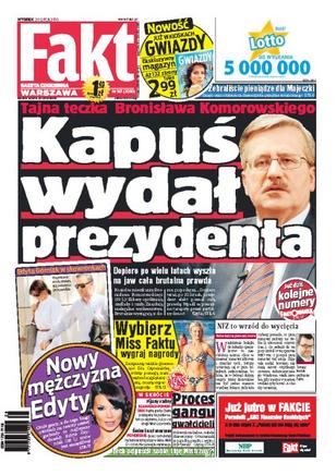 Dopiero po wielu latach wyszła na jaw cała brutalna prawda związana z Bronisławem Komorowskim; wybierz letnią Miss Faktu; jak powinna zachować się Polska w obliczu porozumienia Berlina z Moskwą; Leszek Balcerowicz trenuje pływanie i pracuje nad złotą opalenizną; w naszym kraju aż 750 tysięcy osób nie ma gdzie mieszkać; Alicja Bachleda-Curuś i Colin Farrell chcą mieć drugie dziecko; jak wygląda nowy chłopak Edyty Górniak; Doda okiełznała wielkiego ochroniarza.