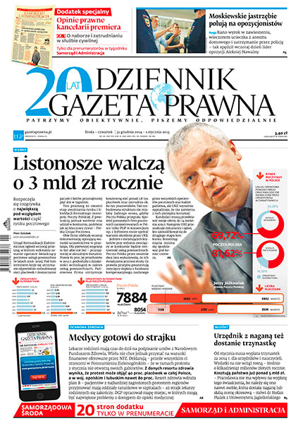 Dziennik Gazeta Prawna – codziennie obiektywne i rzetelne informacje z kraju i ze świata. Piszemy o tym, co dziś ważne i odpowiadamy na Wasze pytania – szczególnie te związane z obecnymi wyzwaniami tj. pandemia, praca zdalna. Na bieżąco wyjaśniamy zmieniające się przepisy. Wspieramy się wyjaśnieniami ministerstw i urzędów. Pomagamy unikać błędów i ostrzegamy, jakie są kary. Ponadto w każdy piątek specjalne magazynowe wydanie Dziennika Gazety Prawnej w całości z tekstami społeczno-ekonomicznymi.