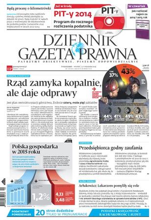 Rząd zamyka kopalnie, ale daje odprawy - jest plan restrukturyzacji górnictwa, zniknie cztery, może pięć zakładów; Ministerstwo Gospodarki w I półroczu 2015 r. wprowadzi ułatwienia dla biznesu, które przewidują ograniczenie liczby i czasu trwania kontroli oraz większe możliwości zaskarżania decyzji kontrolerów; Arłukowicz: Lekarzom pomyliły się role; od początku roku sędziowie dostają o połowę mniej pieniędzy za dojazdy do pracy, będą walczyć w sądach pracy o wyrównanie im kilometrówek do poziomu posłów i senatorów oraz wypłacanych w latach 2012-2013; polska gospodarka w 2015 roku: DGP przeprowadził ankietę dotyczącą prognoz makroekonomicznych na rozpoczynający się rok wśród analityków 16 krajowych instytucji.