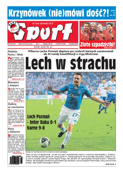 Piłkarze Lecha Poznań dopiero po rzutach karnych pokonali Inter Baku i awansowali do III rundy kwalifikacji do Ligi Mistrzów; zawodnicy Wisły Kraków są skoncentrowani przed dzisiejszym meczem z FC Siauliai; jak wygląda ekonomia polskich klubów piłkarskich; czy Jacek Krzynówek zakończył sportową karierę; rozważania przed najbliższym wyścigiem Formuły 1; kto ma największe szanse na zwycięstwo w Tour de France.