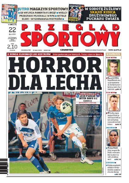 Lech Poznań pokonał po serii rzutów karnych Inter Baku i awansował do III rudny eliminacji Ligi Mistrzów; Wisła Kraków musi dopełnić formalności i zwyciężyć w dwumeczu z FC Siauliai; Arkadiusz Onyszko ma zamiar szybko wrócić do gry i solidnie wypełnić kontrakt z Polonią Warszawa; Jacek Krzynówek postanowił zakończyć sportową karierę; Robert Kubica stanie przed wymagającym zadaniem podczas najbliższego wyścigu Formuły 1.