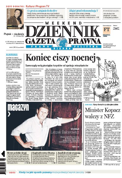 Koniec z ciszą nocną, samorządy zdecydowanie wolą pieniądze turystów od spokoju mieszkańców; resort zdrowia rozważa likwidację Narodowego Funduszu Zdrowia; w ciągu ostatniej dekady przemyt podrabianych towarów wzrósł 10-krotnie; LOT wyda 400 mln dolarów na 20 nowych samolotów; oszukani klienci zagranicznych sklepów internetowych mają problemy z odzyskaniem należności; kiedy i w jaki sposób pozwany może podważyć wyrok zaoczny; wywiad z Leszkiem Balcerowiczem.