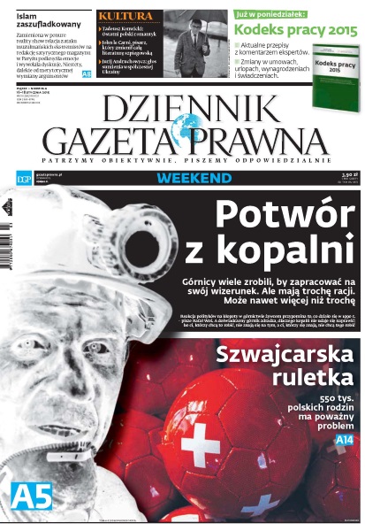 Reakcja rządu i opinii publicznej na kryzys w polskim górnictwie to dość smutne widowisko - czy niczego się nie nauczyliśmy przez te 25 lat budowania demokracji i kapitalizmu; oczekiwanie na odejście osoby śmiertelnie chorej to czas cenny przede wszystkim dla jej bliskich - łatwiej im się pogodzić z osieroceniem; ponad pół miliona osób spłacających kredyty mieszkaniowe we frankach nie ma powodów do zadowolenia - szwajcarski Bank Centralny (SNB) zrezygnował z powiązania kursu franka z euro; 17 lipca 2014 r. pocisk w kierunku malezyjskiego boeinga odpalili żołnierze 53 Brygady z Kurska - takie są ustalenia międzynarodowego śledztwa dziennikarskiego; trwają prace nad firmowaną przez prezydenta Strategią Bezpieczeństwa RP; technologia produkcji hełmów z Instytutu Morateks i Wojskowego Instytutu Techniki Uzbrojenia już została wdrożona do produkcji.