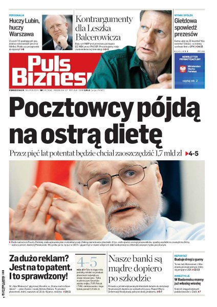 Nie wszyscy podzielają opinie ekonomisty w sprawie fuzji PKO BP i BZ WBK; Poczta Polska przejdzie lifting i oszczędzi miliardy, nie obejdzie się jednak bez rekordowych zwolnień; mądre po szkodzie banki lustrują kredytobiorców; notowania prezesa KGHM spadają, jutro zbiera się rada nadzorcza Polskiej Miedzi; największe telewizje łatają budżety wpływami ze sponsoringu; Adam Bisek z uporem stara się popularyzować budowę dróg z gumowego asfaltu, ale pasja astronauty pcha go także w inne dziedziny biznesu; lada dzień ruszy sezon wyników finansowych na GPW; na 91 banków z 20 europejskich krajów test wytrzymałości oblało tylko siedem.