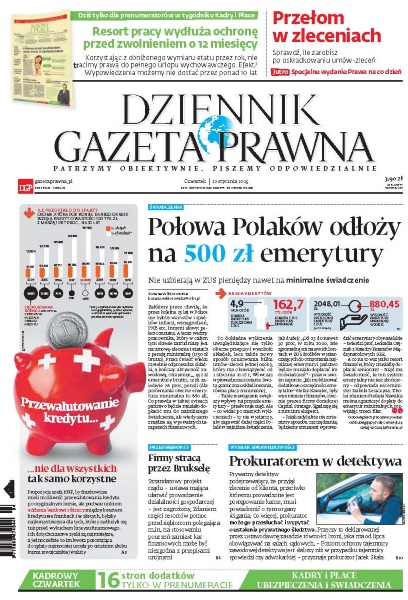Połowa Polaków odłoży na 500 zł emerytury - nie uzbierają w ZUS pieniędzy nawet na minimalne świadczenie; propozycja szefa KNF, by frankowicze mieli możliwość przewalutowania kredytu po oryginalnym kursie, ale pod warunkiem oddania bankowi różnicy między kosztem kredytu we frankach i w złotych, byłaby najkorzystniejsza dla tych, którzy zadłużyli się tuż przed wybuchem kryzysu finansowego; sztandarowy projekt rządu – ustawa mająca ułatwić prowadzenie działalności gospodarczej jest zagrożony; prywatny detektyw podejrzewający, że przyjął zlecenie od klienta, przeciwko któremu prowadzone jest postępowanie karne, musi powiadomić o tym organy ścigania - co więcej, prokurator może go przesłuchać i wypytać o ustalenia prywatnego śledztwa.
