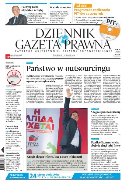 Stanisław Kostrzewski, były skarbnik Prawa i Sprawiedliwości, odkrywa kulisy rozliczania kampanii wyborczych; najwięcej wydają mieszkańcy Mazowsza - Ślązacy robią zakupy aż o ponad 45 proc. skromniejsze niż przeciętny Polak; Sąd Najwyższy przy składaniu wniosku do Trybunału Konstytucyjnego poprosił o pomoc prywatną kancelarię; banki powinny uwzględniać ujemny LIBOR w całości, a nie tylko do wysokości marż, o ile w umowach wpisywały zasadę „LIBOR plus marża” – ocenia w DGP Andrzej Raczko, członek zarządu NBP; firma może odliczyć cały podatek, nawet jeśli pracownik jeździ służbowym autem do pracy i z powrotem; zatrudniający muszą dostrzec to, że ich pracownicy mają też obowiązki rodzinne – mówi DGP prof. Irena E. Kotowska z PAN; lewicowa Syriza wygrała wybory parlamentarne w Grecji, zdobywając od 36 do 39 proc. głosów; jeżeli ktoś miał kiedyś biznes i mu się nie powiodło, będzie mógł skorzystać z przepisów dotyczących oddłużenia przewidzianych dla konsumentów.