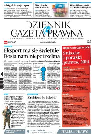 Dyrektorzy niedofinansowanych szkół i przedszkoli znaleźli sposób na pozyskanie dodatkowych pieniędzy - zakładają stowarzyszenia i zachęcają rodziców do przekazywania procenta z podatków; wśród zadłużonych w szwajcarskiej walucie są prawdziwi pechowcy z kredytami i absurdalnie wysokimi kosztami obsługi; czy cięcia w sądownictwie nie ominą również ekspertów i świadków; w 2014 roku nasze firmy sprzedały za granicą żywność wartą 21 mld euro; obywatel Ukrainy z paszportem biometrycznym będzie mógł liczyć na wjazd bez wizy Schengen do UE - tak wynika z nieoficjalnych informacji DGP; osoby, które mają podejrzenie nowotworu, ale nie uzyskały zielonej karty od lekarza rodzinnego, nadal obowiązują szpitalne kolejki - na listy oczekujących wpisywane są np. pacjentki, które zamiast do medyka pierwszego kontaktu zgłosiły się na mammografię czy biopsję bezpośrednio do szpitala.
