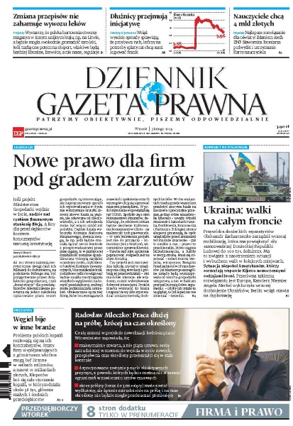 Wystarczy, że polska hurtownia otworzy magazyn w innym unijnym kraju, np. na Litwie, a będzie mogła swobodnie gromadzić tam leki; wciąż wysokie spready sprawiają, że przybywa tych, którzy na potrzeby spłaty rat chcą sami kupować franki; nauczyciele chcą 4 mld złotych; sytuacja na Ukrainie niepokoi Amerykanów, którzy rozważają wsparcie Kijowa nowoczesnymi rodzajami broni; jeśli projekt Ministerstwa Gospodarki wejdzie w życie, nadzór nad rynkiem finansowym stanie się fikcją, a fory dla przedsiębiorców kosztem konsumentów naruszą konstytucję; problemy polskich kopalń rozlewają się na ich kontrahentów - straty firm współpracujących z górnictwem wkrótce mogą być liczone w setkach milionów, a nawet w miliardach złotych.