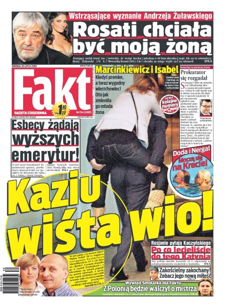 Kazimierz Marcinkiewicz taszczy żonę jak osiołek; prokuratorzy przesłuchiwali prezesa PiS trzy godziny; poseł Nowak codziennie biega kilka kilometrów, by odreagować polityczne stresy; Andrzej Żuławski zwierzył się, że wciąż kocha młodszą o 44 lata Weronikę Rosati, ale odrzucił jej oświadczyny; małpa z wrocławskiego zoo malowała obrazy, które mogą być warte fortunę; Maciej Zakościelny zakochał się w pięknej modelce; Doda i Nergal relaksują się w pięciogwiazdkowym hotelu; kibice zastanawiają się, czy Euzebiusz Smolarek na pewno będzie wzmocnieniem zespołu Polonii Warszawa; jeden rzut wystarczył Szymonowi Ziółkowskiemu do awansu do finału mistrzostw Europy.