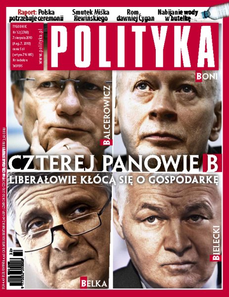 Boni, Belka, Balcerowicz i Bielecki spierają się o przyszłość polskiej gospodarki; rozmowa z prof. Ireną Lipowicz, nową rzeczniczką praw obywatelskich, o tym, czego nie będzie robić i gdzie nie widzi problemów; wyższe uczelnie obawiając się niżu demograficznego mamią swoich potencjalnych studentów licznymi promocjami; nieznośna rodzina Romów z Limanowej; dlaczego Polacy tak bardzo potrzebują wyniosłych ceremonii; rachunek sumienia rodem z NRD; wywiad z Januszem Rewińskim; pogańskie korzenie corridy; londyński ślady Beatlesów; raj kobiecej niezależności; co kryją w sobie butelki z wodą mineralną.