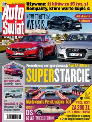 Aktualności: Audi A4 i BMW serii 3, Kia Venga, Audi TT roadster, Toyota Avensis, VW Caddy; testy: Ford Mondeo, Opel Insignia, Peugeot 508 i VW Passat, Hyundai ix35; porady: tani tuning z internetu, części zamienne, pomyłka podczas tankowania, aplikacje dla kierowców; z drugiej ręki: Kia Soul I (2009-14), kompakty w cenie do 15 000 zł, zrób to sam - Toyota Avensis II; fascynacje: Citroen DS ma 60 lat.