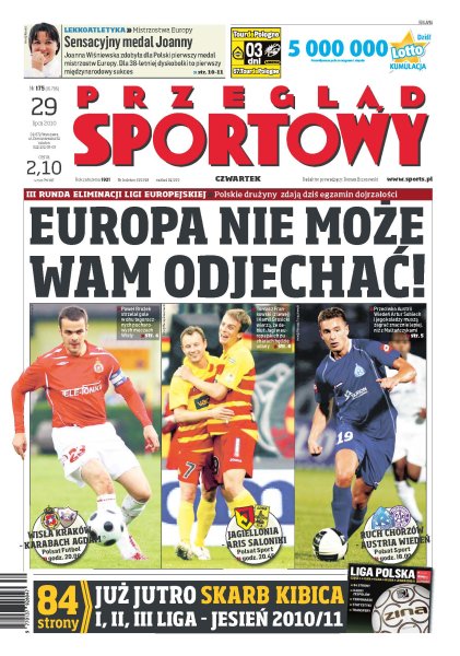 Wywiad z Euzebiuszem Smolarkiem; Kamil Drygas – nastolatek – zadebiutował przeciwko Sparcie w pierwszym składzie; Krakowianie twierdzą, że wyciągnęli wnioski z meczu Lecha z Interem Baku; Marcin Malinowski jako piłkarz Odry już raz pokonał wiedeńczyków; stołeczni piłkarze nie byli gorsi od gospodarzy, ale niestety przegrali spotkanie po rzucie karnym; wywiad z Mariuszem Lewandowskim, piłkarzem Sewastopolu; na ten medal czekaliśmy 64 lata, 38–letnia Joanna Wiśniewska osiągnęła wczoraj w Barcelonie życiowy sukces; po zakończeniu sezonu żużlowego lider klasyfikacji Grand Prix ruszy śladami Jacques’a Cousteau.