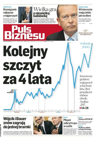 Główna stawka VAT ma wzrosnąć o 1 pkt proc., a PIT, CIT i składka rentowa – zostać po staremu; warta 100 mln zł sprzedaż Stream Communications ostro poróżniła czeską Pentę i Jana Rynkiewicza; Biedronka chce do końca roku otworzyć jeszcze 90–100 sklepów; skarbówka wykryła lewe faktury w spółce zależnej Mispolu; drogi Rafała Bauera i Michała Wójcika znów się przecięły; 45 proc. pracodawców sprawdza potencjalnych kandydatów w serwisach społecznościowych; jeśli wynagrodzenie pracownika nie zadowala, to już się nie boi zmienić pracy; w czwartek wartość budowanego razem z internautami Portfela PB była już o 22 proc. wyższa niż na początku roku.