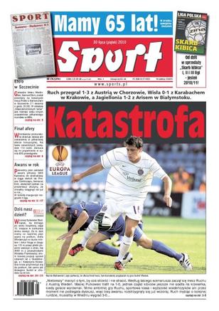 Dzisiaj przypada 65. rocznica narodzin „Sportu”; Ruch przegrał 1–3 z Austrią w Chorzowie, Wisła 0–1 z Karabachem w Krakowie, a Jagiellonia 1–2 z Arisem w Białymstoku; Ebi Smolarek na pewno nie zagra przeciwko Górnikowi całego meczu; dziś o 18.00 zabrzanie zagrają ostatni sparing przed inauguracją ligi; w odmłodzonej przez trenera Jerzego Matlaka reprezentacji Polski zabrakło miejsca dla kilku doświadczonych zawodniczek, które jeszcze niedawno stanowiły trzon reprezentacji siatkarek; w najbliższą niedzielę etapem z Sochaczewa do Warszawy rozpocznie się 67. Tour de Pologne, który zakończy się 7 sierpnia w Krakowie.