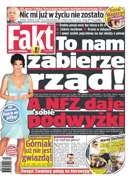 NFZ nie ma ma pieniędzy na leczenie, ale podwyżki sobie daje; Marek Dochnal nosi klapki za 1100 złotych; jedynym celem Jarosława Kaczyńskiego jest w tej chwili wyjaśnienie okoliczności smoleńskiej tragedii; burmistrz Pszczyny wynajął firmę z fotoradarem; Katarzyna Sobczyk nie żyje; czy występ Edyty Górniak poprzedzi koncert Piotra Kupichy; u Ani Popek na imieninach był piękny bal; Tomasz Gollob i Marek Cieślak potrafią odkryć każdy podstęp na torze przygotowany przez gospodarzy; przygotowanie kanału F w bolidzie Roberta Kubicy kosztowało aż milion euro; kompromitacja zespołów Ruchu, Jagiellonii i Wisły; płotkarz Artur Noga jest niesamowitym twardzielem.