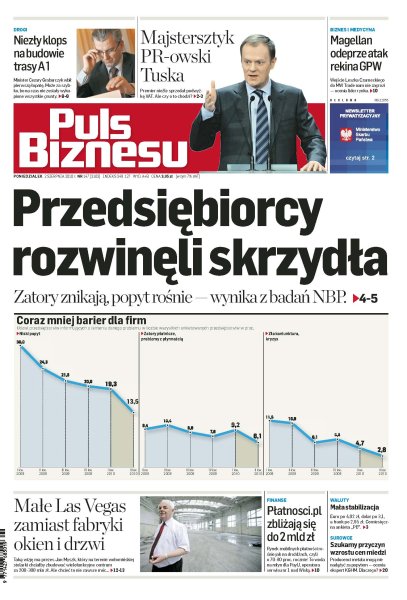 Oprócz podwyżki VAT premier poszuka dochodów w prywatyzacji i sprzedaży ziemi; drugi kwartał firmy zaliczą do udanych: sprzedaż wystrzeliła, a bariery rozwoju są mniej dokuczliwe; Polacy obawiają się płacić w internecie kartą; drogowcy spóźniają się z wywłaszczeniami na trasie Toruń – Stryków; na Pomorzu Zachodnim powstaje sieć portów i przystani jachtowych; Marcin Kiepas z XTB, który jako jedyny przed miesiącem obstawiał wyraźne umocnienie naszej waluty, teraz spodziewa się stabilizacji kursu; na rynkach towarowych drożeje miedź – inwestorzy mogą dyskontować mniejszą jej produkcję w przyszłości.