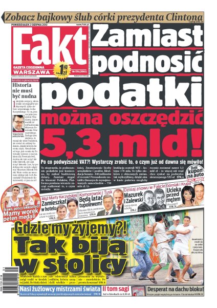 Nie trzeba podnosić podatku VAT i fundować podwyżek, by dopiąć budżet na przyszły rok; czy Marta Kaczyńska zamieszka w hotelu za 400 zł; Tu–154 po remoncie w Rosji wróci do kraju do końca sierpnia; groza w Gorzowie, Krzysztof O. wszedł po ścianie na 30–metrowy blok i groził, że skoczy; Edyta Górniak wolała przełożyć występ, niż spotkać się z Darkiem Krupą; jaka jest tajemnica Majki Jeżowskiej; przez gapiostwo mechanika Robert Kubica nie ukończył wyścigu; drużyna polskich żużlowców znowu najlepsza na świecie; potwierdziły się przewidywania fachowców: w mistrzostwach Europy w Barcelonie polscy lekkoatleci wywalczyli dziewięć medali – dwa złote, trzy srebrne i cztery brązowe.