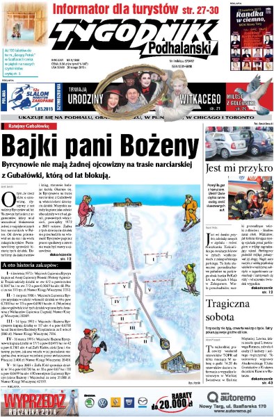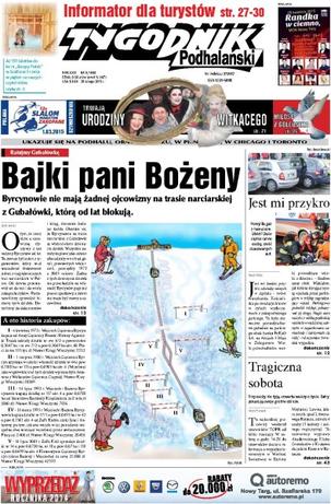 Byrcynowie nie mają żadnej ojcowizny na trasie narciarskiej z Gubałówki, którą od lat blokują; pomyliła gaz z hamulcem, efekt – dwie ciężko ranne osoby, sześć skasowanych aut; trzy osoby nie żyją, czwarta walczy o życie – Tatry pokazują swoje groźne oblicze; rodzina z Ludźmierza w pożarze straciła dach nad głową; z powodu wojny między dwiema potężnymi sieciami farmaceutycznymi - apteka w nowotarskim szpitalu nie działa od niemal pięciu miesięcy.