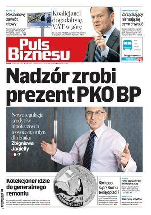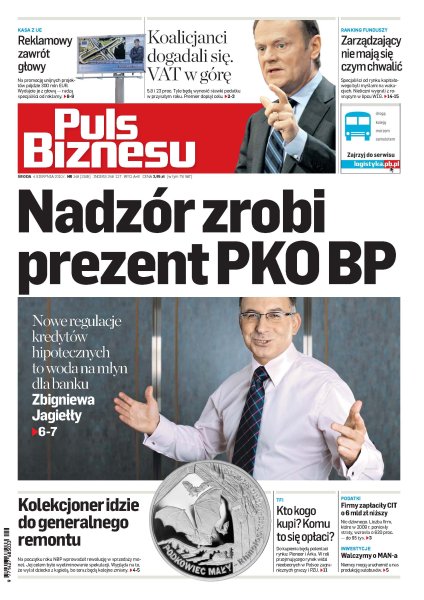 Nowe regulacje kredytów hipotecznych to woda na młyn dla banku Zbigniewa Jagiełły; premier Donald Tusk i wicepremier Waldemar Pawlak doszli do porozumienia; krytykowany system Kolekcjoner idzie do generalnego remontu; specjaliści radzą wydawać pieniądze nie tylko na reklamę, ale i edukację; ulubionymi sklepami nad Wisłą są Biedronka, Tesco i Lidl; co PKO BP zrobi z Arką po przejęciu BZ WBK i czy PZU jest zainteresowany odkupieniem; oszczędność czasu to jedna z głównych korzyści instalowania oprogramowania do zarządzania placówką medyczną; w lipcu najlepszy fundusz przyniósł 18,4 proc. zysku, a najgorszy 13,4 proc. straty.