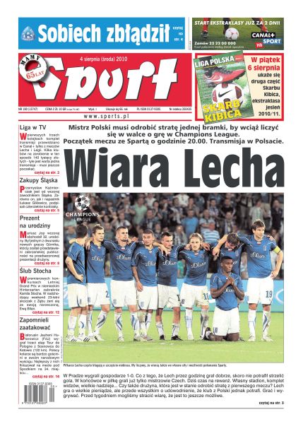 Mistrz Polski musi odrobić stratę jednej bramki, by wciąż liczyć się w walce o grę w Champions League; znane są już dokładne terminy trzech pierwszych kolejek ekstraklasy; do 300 tysięcy złotych zwiększył Lech premię za pokonanie praskiej Sparty; Waldemar Fornalik i chorzowscy działacze nie kryją zdegustowania poniedziałkowym wywiadem Artura Sobiecha; w szesnastu klubach ekstraklasy na sezon 2010/11 zostało już zarejestrowanych 109 obcokrajowców; Roberto Baggio – legenda włoskiej piłki – powraca, tym razem w charakterze dyrektora technicznego tamtejszej federacji; w premierowych konkursach Letniej Grand Prix zabraknie Kamila Stocha, który w sobotę się żeni; polscy kolarze są bardzo gościnni w swoim narodowym wyścigu.