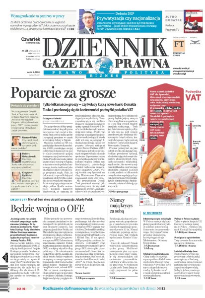 Tylko kilkanaście groszy – czy Polacy kupią nowe hasło Donalda Tuska i przekonają się do konieczności podwyżki podatku VAT; prywatne pieniądze pozwolą na inwestycje w kurortach, bo kontrakty z NFZ wystarczają tylko na wegetację; kolejny bubel prawny: urzędnik zdecyduje, jaka inwestycja ma negatywny wpływ na środowisko; nowa ustawa, która w życie ma wejść jeszcze w tym roku, ma zakazać prowadzenia schronisk tylko dla zysku; gospodarka naszych zachodnich sąsiadów szybciej niż oczekiwano pokonuje recesję; Geelay, nowy właściciel Volvo, chce zmienić status marki, bo milionerzy z Państwa Środka gotowi są płacić za prestiż; zasady prawidłowego rozliczania dofinansowania do wczasów pracowników i ich dzieci.
