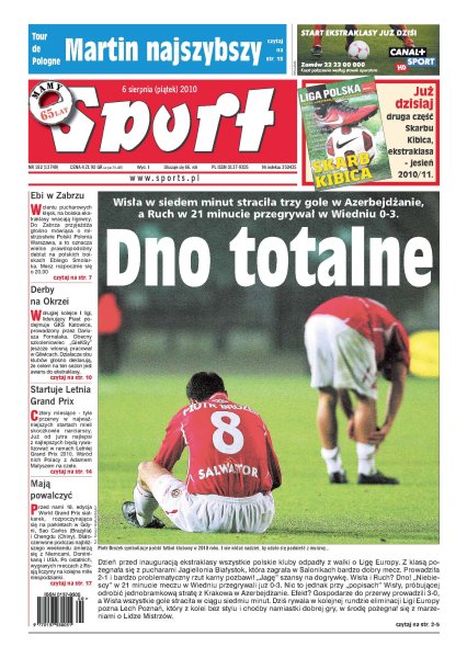 Wisła w siedem minut straciła trzy gole w Azerbejdżanie, a Ruch w 21. minucie przegrywał w Wiedniu 0-3; rumuński sędzia Alexandru Deaconu nie dał szansy piłkarzom Jagiellonii na to, by znaleźli się w czwartej rundzie eliminacji do Ligi Europy; już jutro Arsenal zagra w Warszawie z Legią z okazji otwarcia nowego stadionu; Holenderska Eredivisie należy aktualnie do średniej klasy europejskich lig; najbliższe dni zdecydują, czy Odra Wodzisław trafi w ręce czeskiego inwestora, czy nie; cztery miesiące – tyle przerwy w najważniejszych startach mieli skoczkowie narciarscy; w ćwierćfinale turnieju w San Diego Agnieszka Radwańska zagra z Shahar Peer z Izraela; Polacy zrehabilitowali się za porażkę z Gruzją, a kluczem do zwycięstwa okazały się rzuty za trzy punkty.