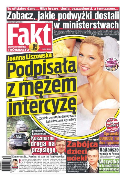 Bronisław Komorowski sam prowadził rodzinne auto z Budy Ruskiej do Warszawy; rząd podwyższa podatek VAT i zmusza do zaciskania pasa, ale sami ministrowie oszczędni nie są; dramatyczny finał komisji hazardowej – w czasie głosowania nad raportem końcowym posłowie znów skoczyli sobie do gardeł; Joanna Liszowska udowodniła Oli Serneke, że nie zależy jej na jego milionach, tylko na miłości; Wisła Kraków i Ruch Chorzów przegrały swoje mecze – Jagiellonia wywalczyła remis, ale też odpadła z Ligi Europejskiej; właściciele polskich klubów latem kupili nowych graczy za 40 mln zł; Justyna Kowalczyk przygotowuje się do kolejnego sezonu.