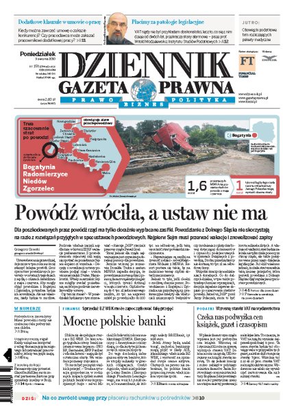 Dla poszkodowanych przez powódź rząd ma tylko doraźnie wypłacane zasiłki, powodzianie z Dolnego Śląska nie skorzystają na razie z rozwiązań przyjętych w specustawach powodziowych; jak płacić rachunki u pośredników za gaz, prąd i raty kredytu, aby uniknąć odsetek za zwłokę; ostatni rok zakupów z odliczeniem dla podatników VAT; resort pracy chce obniżyć składkę do OFE; nowelizacja ustawy o doradztwie podatkowym daje doradcom uprawnienia do reprezentowania podatników w sprawach celnych i egzekucji administracyjnej związanej z obowiązkami podatkowymi i celnymi.