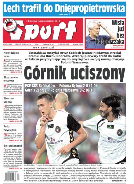 Artur Sobiech jeszcze niedawno strzelał bramki dla Ruchu Chorzów, a wczoraj pierwszy trafił do siatki w Zabrzu przyczyniając się do zwycięstwa swojej nowej drużyny, Polonii Warszawa; „historyczne” porażki z zespołem z Azerbejdżanu skłoniły trenera Henryka Kasperczyka do złożenia dymisji; ostatnia szansa przed Lechem w europejskich pucharach; w pierwszej lidze gliwicki Piast zwyciężył katowicki GKS; Tomasz Gollob przed szansą na zdobycie dziewiątego indywidualnego mistrzostwa kraju; męska reprezentacja koszykarzy zdała test w meczu z Portugalią; polskie siatkarki udanie zainaugurowały występy w tegorocznym World Grand Prix; ostatni górski etap nie dał jeszcze odpowiedzi, kto zostanie zwycięzcą 67. edycji wyścigu Dookoła Polski, ale szanse Polaków mocno stopniały.