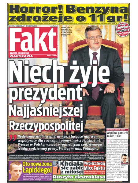 Bronisław Komorowski został zaprzysiężony na urząd Prezydenta Rzeczypospolitej; jak wyglądał pierwszy dzień nowego prezydenta: politycy ze wszystkich opcji mu gratulowali, ale zabrakło wśród nich Jarosława Kaczyńskiego; od stycznia przyszłego roku drastycznie zdrożeją paliwa; 19-latka kilka godzin siedziała na parapecie – chciała się zabić z miłości; wielki finał Miss Faktu 2010; wielka piłka w Warszawie: na otwarcie stadionu Legii przyjeżdża Arsenal Londyn; Polonia Warszawa i GKS Bełchatów pierwszymi liderami ekstraklasy.